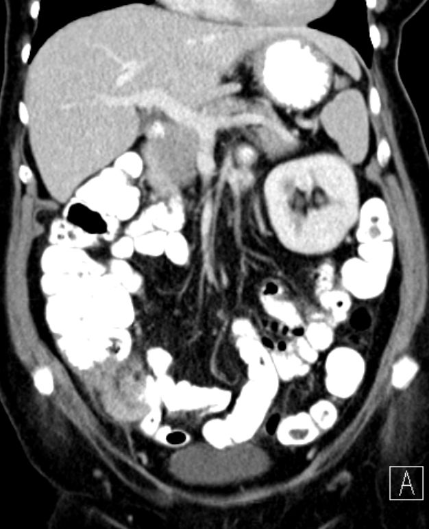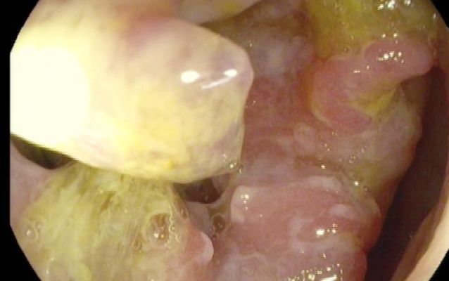 Coloskopie: zirkuläres, exophytisch und ulzerierend wachsendes Karzinom mit einer Größe von 60 mm im Colon ascendens, nicht passierbar.![]() |