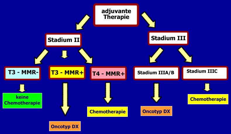 Oncotype DX Colon Cancer Assay, 12 - Gene - Colon - Cancer - Recurrence - Score - Assay | Bei der Therapieentscheidung der adjuvanten Therapie des Colonkarzinoms im Stadium II und III sind Stadium, MMR-Status (MisMatchRepair - Defizit) wichtig. Bei mittlerem Risiko kann der Oncotyp DX die Entscheidung erleichtern.![]() |