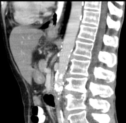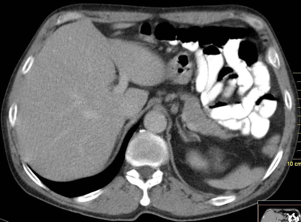 Das CT zeigt vergrößerte Lymphknoten am Truncus coeliacus (nicht histologisch verifiziert)![]() | ||