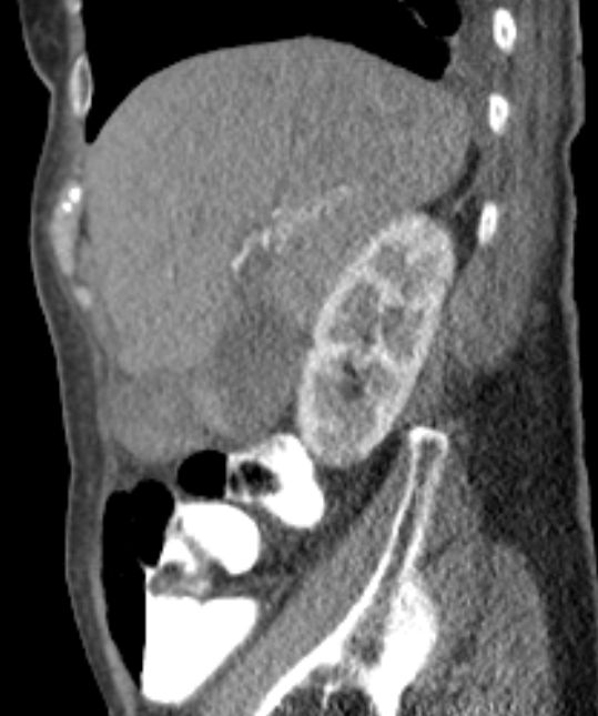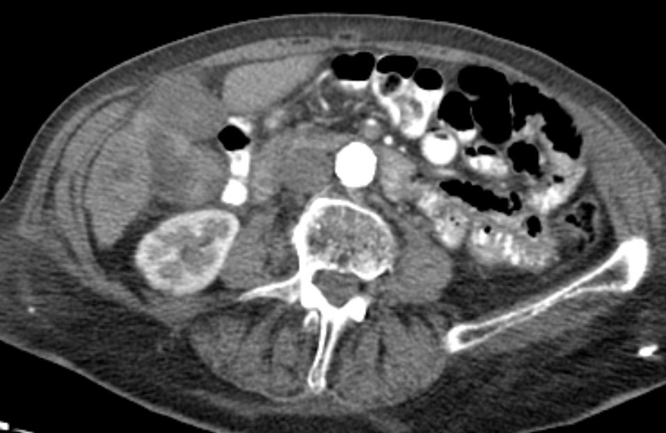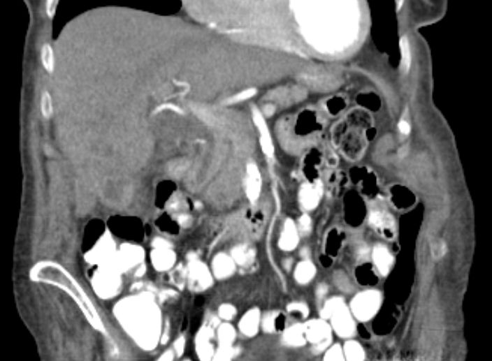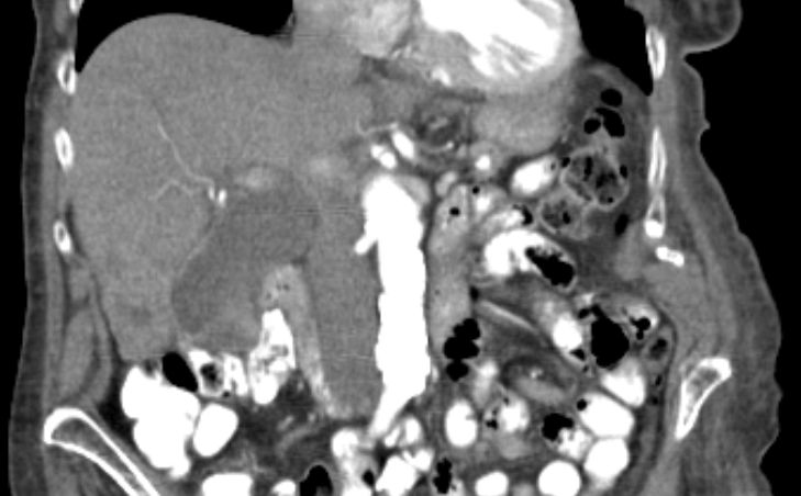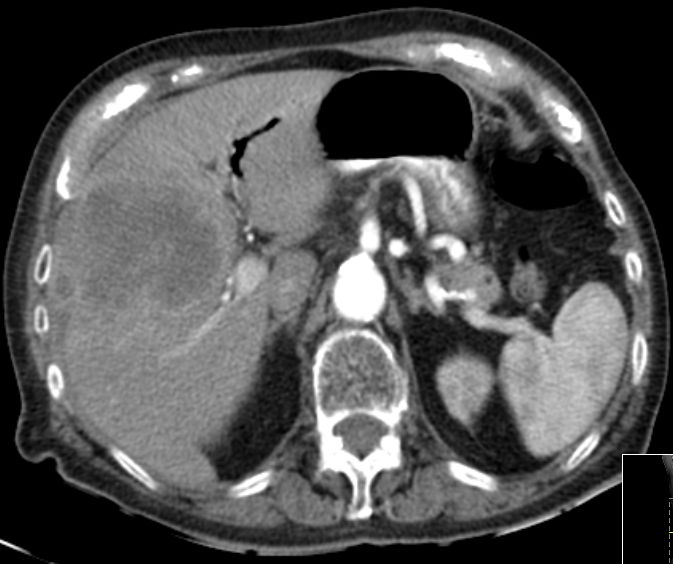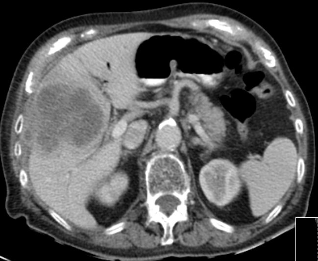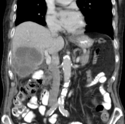 89-jährige Frau mit Infektzeichen. Zunächst sonographisch Verdacht auf Gallenblasenempyem. Im CT ein Gallenblasenkarzinom mit Leberinfiltration. Wegen Alter und AZ palliative Versorgung. | ||