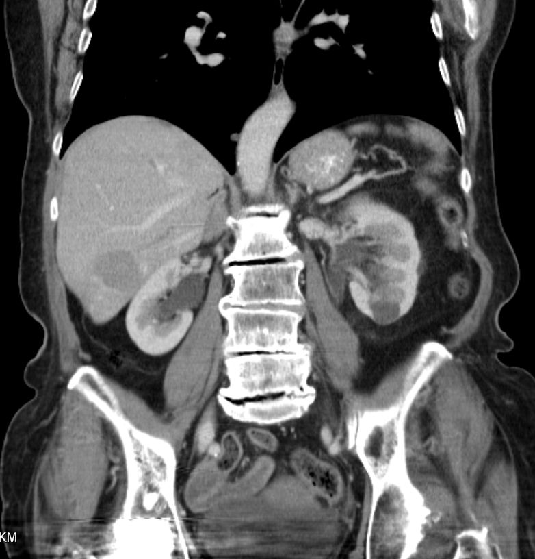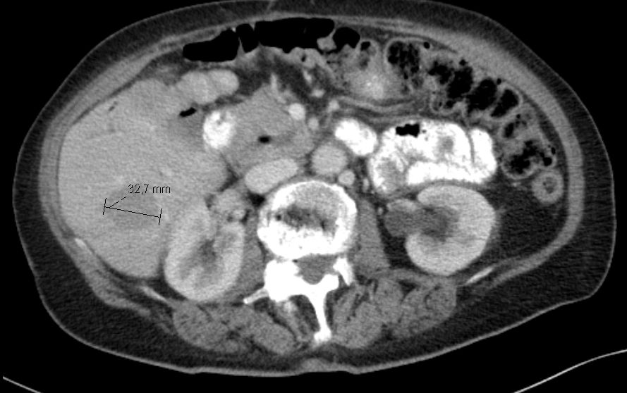 79-jährige Frau, die vor einem Jahr eine Klatskin-Tumor pT2 pNo Mo LoV1 G2 entwickelte. Operation Ro. Jetzt Lebermetastase. Chemotherapie mit Gemcitabine: Progress.![]() |
