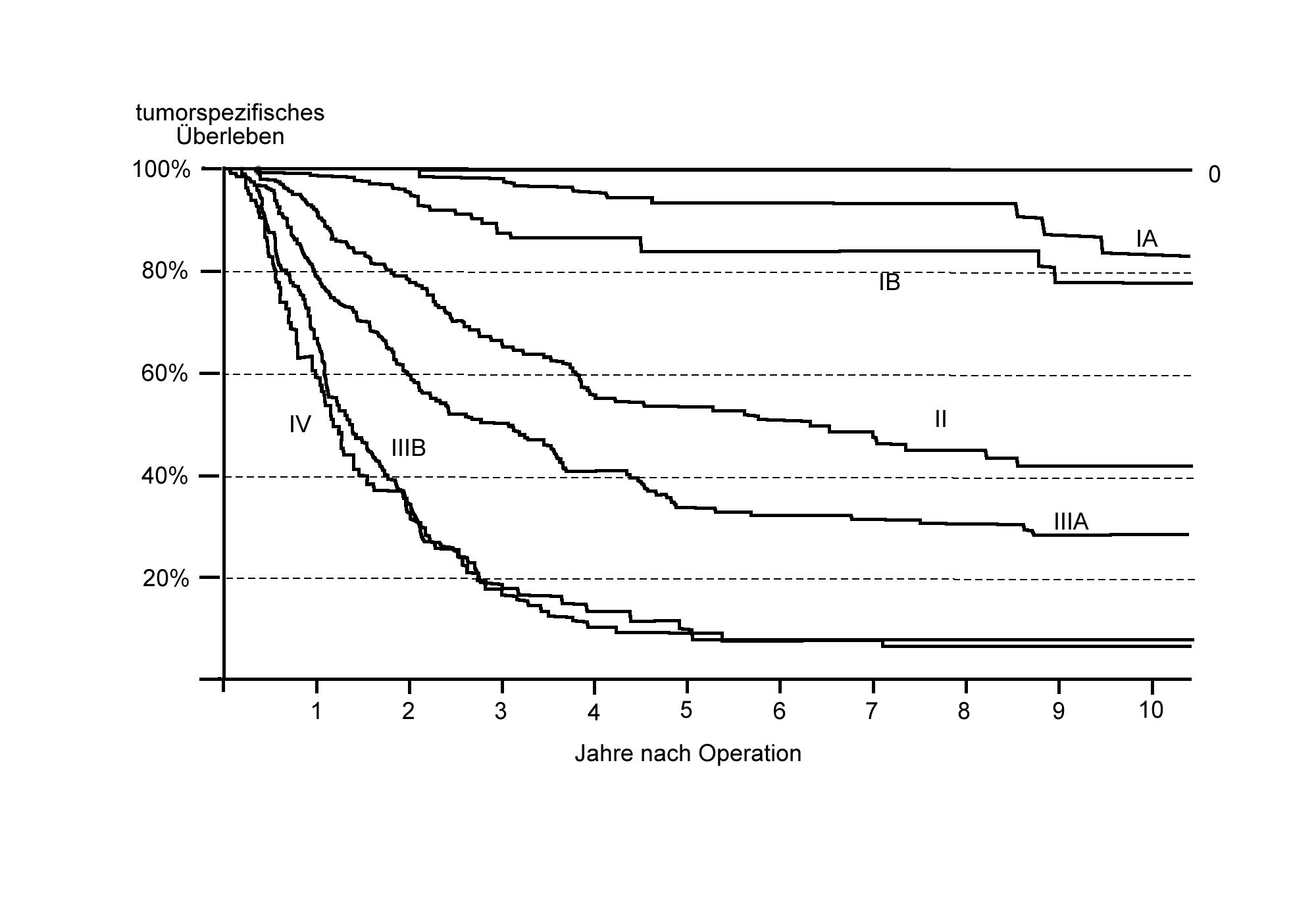 | Prognose | ![]() Magenkarzinom - Sterblichkeit operierter Tumore unterschiedlicher Stadien. | ||||||||||||||||||||||||||||||||