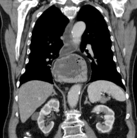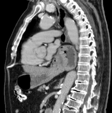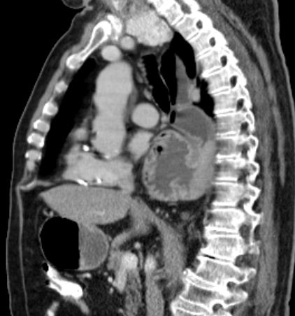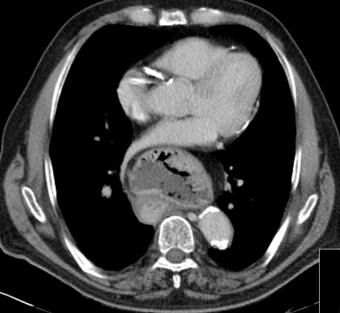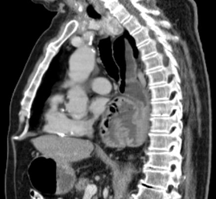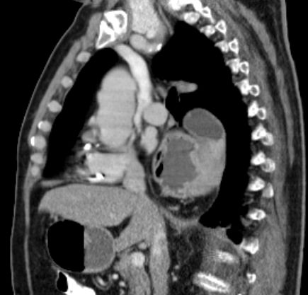Das CT zeigt eine breite Zwerchfellhernie mit Teilen des Magens.![]() |