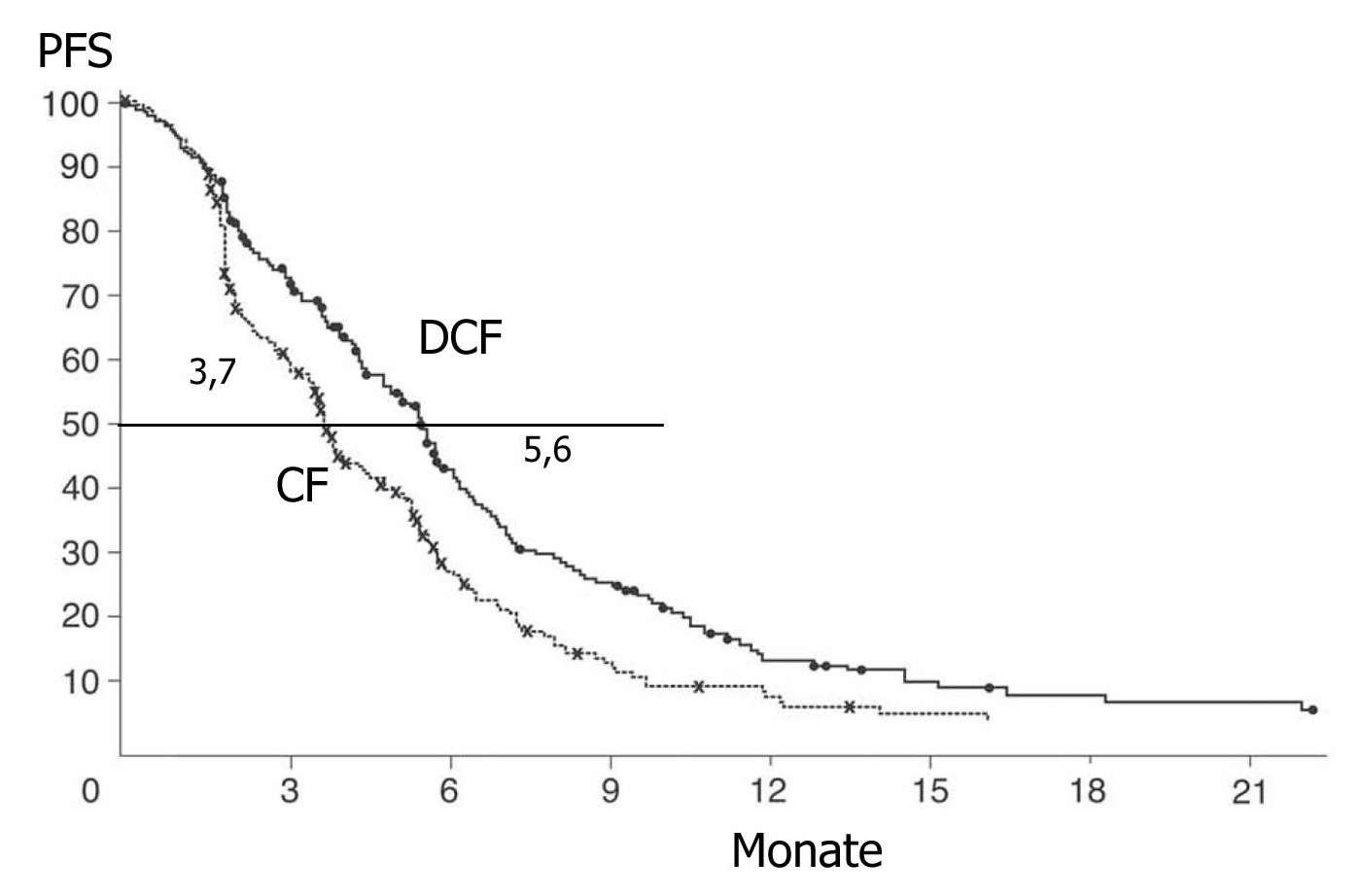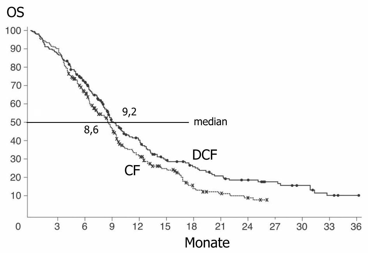 DCF | Docetaxel 75 mg/qm d1 | Cisplatin 75 mg/qm d1 | 5-FU 750 mg/qm d1-d5 | q22 | |||||||||||||||||||||||||||||||||