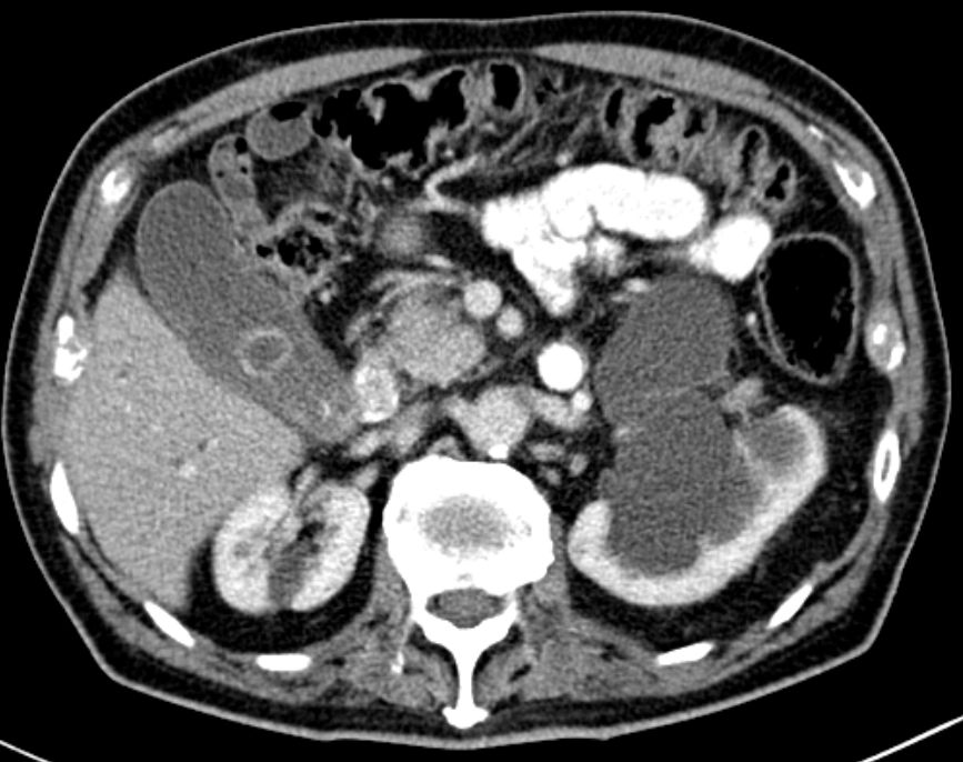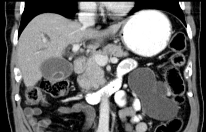 Das CT zeigt erweiterte intrahepatische Gallengänge.![]() |