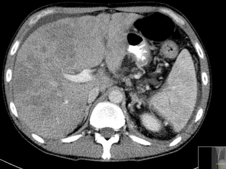 Histologische Sicherung vor 6 Monaten: schlecht differenziertes Adenokarzinom. Chemotherapie: FOLFOXIRI. Restaging: Progress. Leber mit Metastasen durchsetzt.![]() |