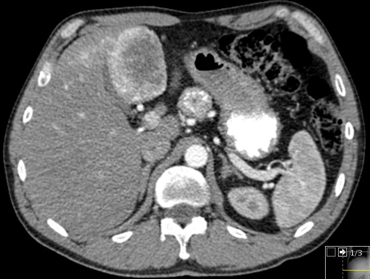 Lymphknoten- und Lebermetastasen. Das CT zeigt eine kontrastmittelaufnehmende