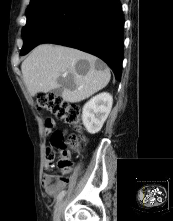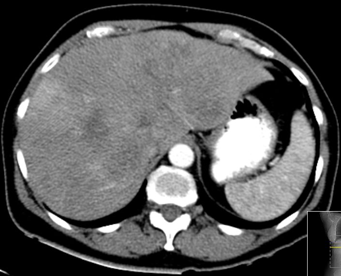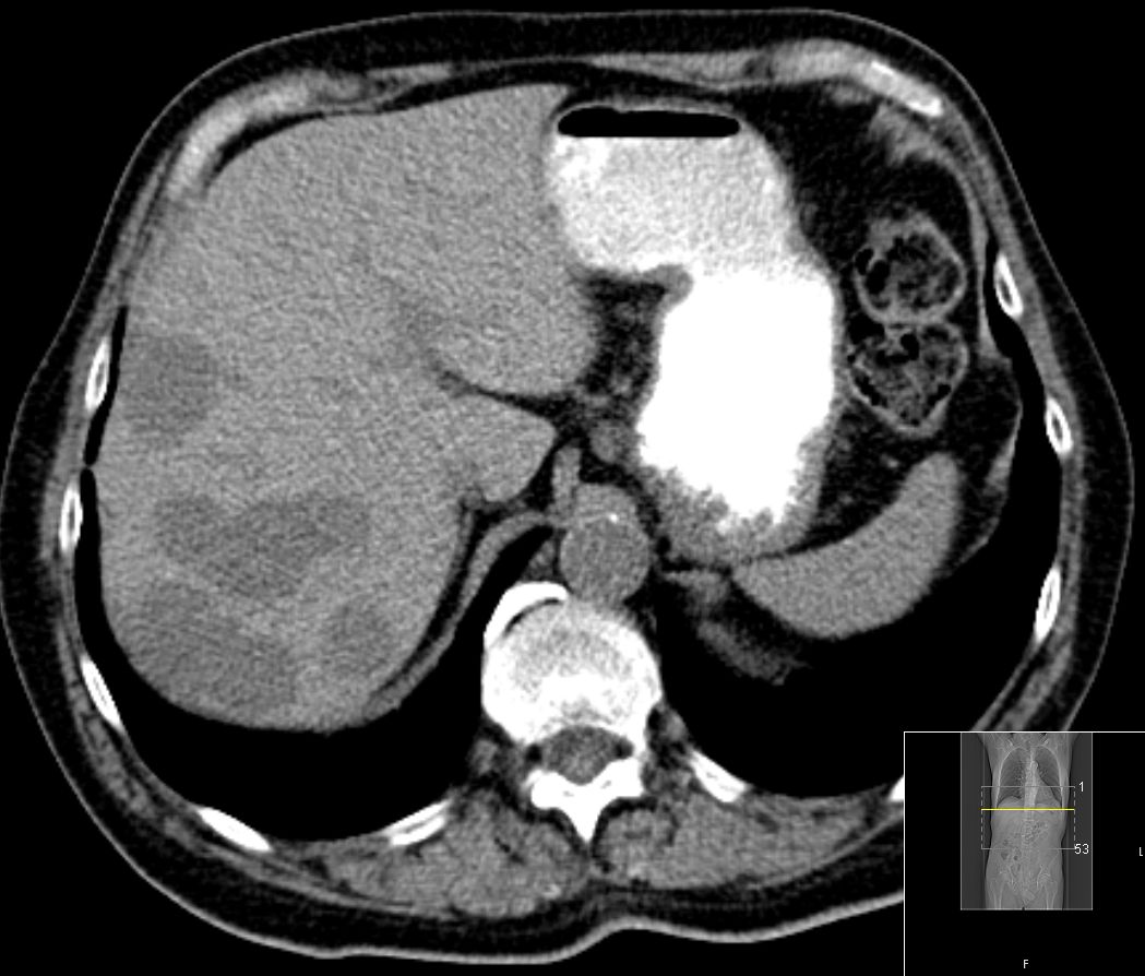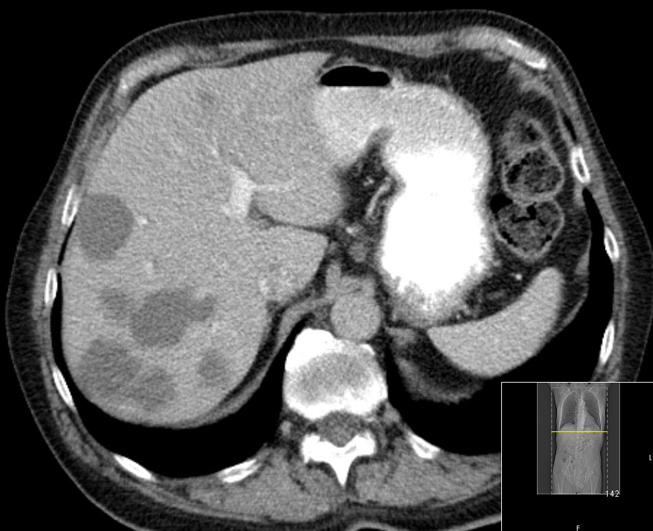 | CT | 61-jährige Frau mit Metastasenleber. Als Primärtumor wurde