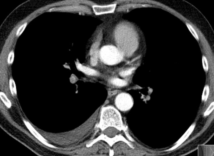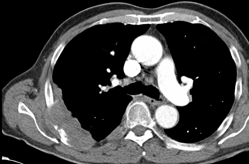 | CT | Tumorausdehnung, Lymphknotenmetastasen (2) | 75-jähriger Mann mit langer Asbest-Exposition. Starke therapieresistente Schmerzen des rechten Thorax.![]() |