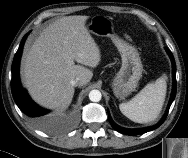 Im Oberbauch ein schmaler Aszitesrand um die Leber erkennbar. Histologisch epitheloides Pleuramesotheliom mit Peritonealbefall (im CT nicht erkennbar).