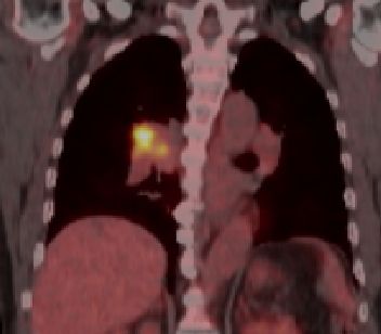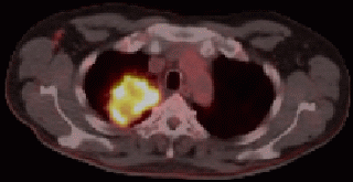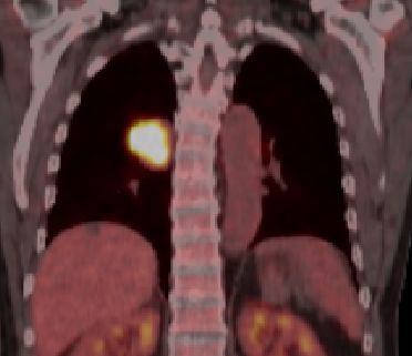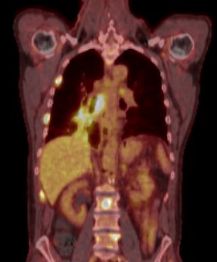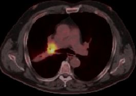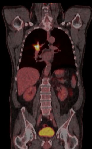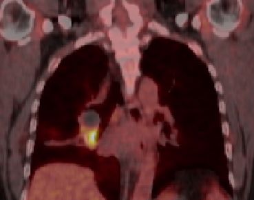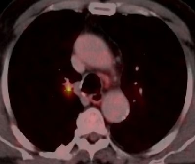 Raumforderung im rechten Hilus. Das PET-CT zeigt, dass der eigentliche Tumor