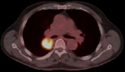 Plattenepithelkarzinom des rechten Lungenunterlappen cT3 cN3 M1. Der Primärtumor im rechten unteren Hilus und die Mediastinalen Lymphknoten reichern deutlich an. Metastasen in der Wirbelsäule und in 3 Rippen rechts sind erkennbar.![]() |