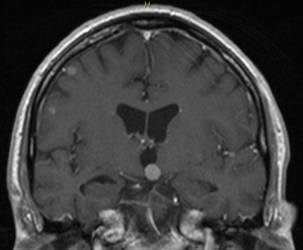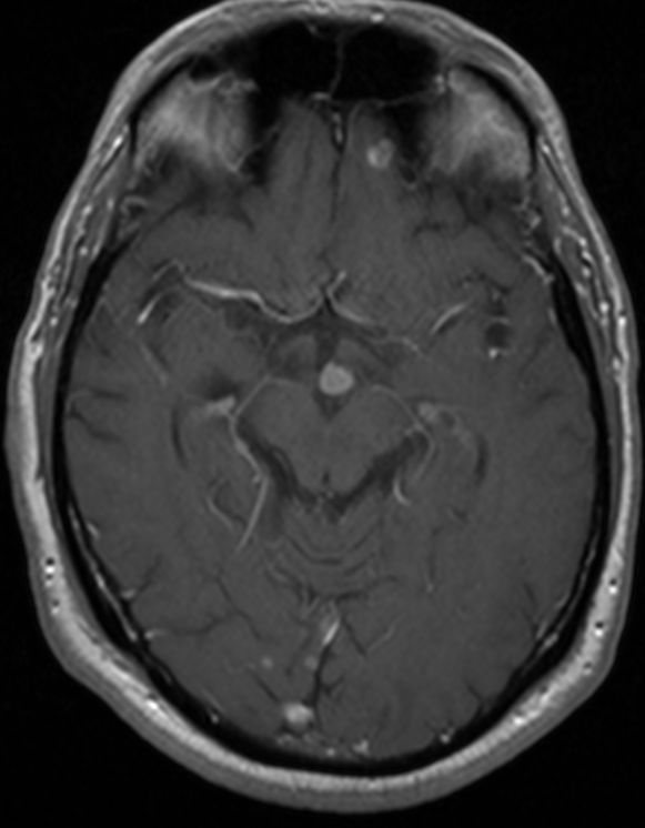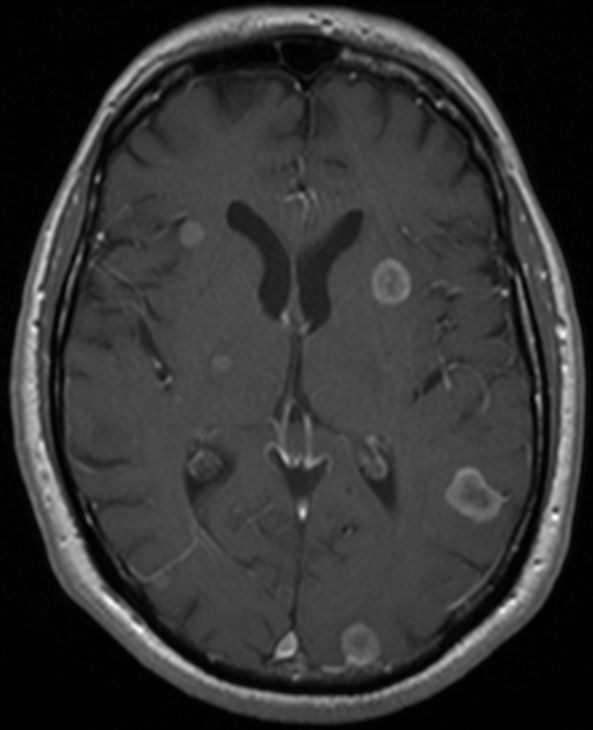 70-jähriger Mann, der vor einem Jahr ein Adenokarzinom des rechten Lungenmittellappens hatte. MRT-Untersuchung des Hirns, T1-Sequenz mit Kontrastmittel. Klinisch keine Symptome! | |||||||||