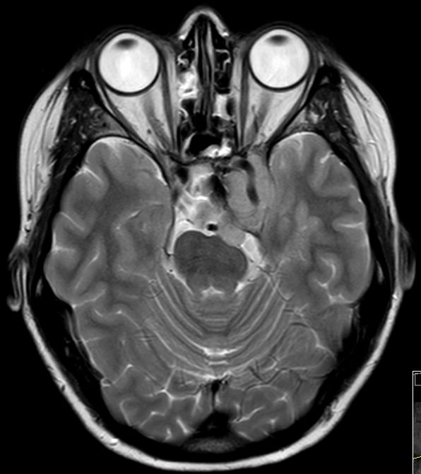 ![]() 78jährige Frau. Hypophysenadenom seit 2 Jahren bekannt. Jetzt Deviation des rechten Auges und Kopfschmerzen. | ||||