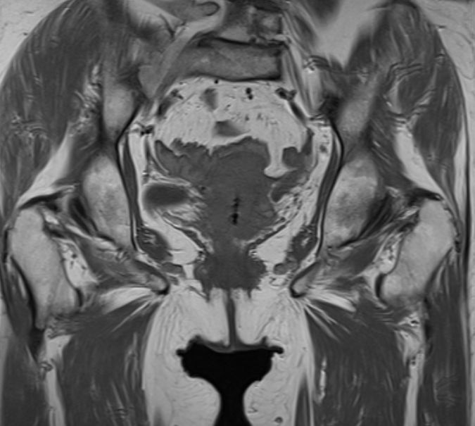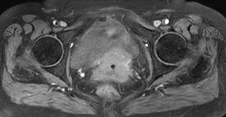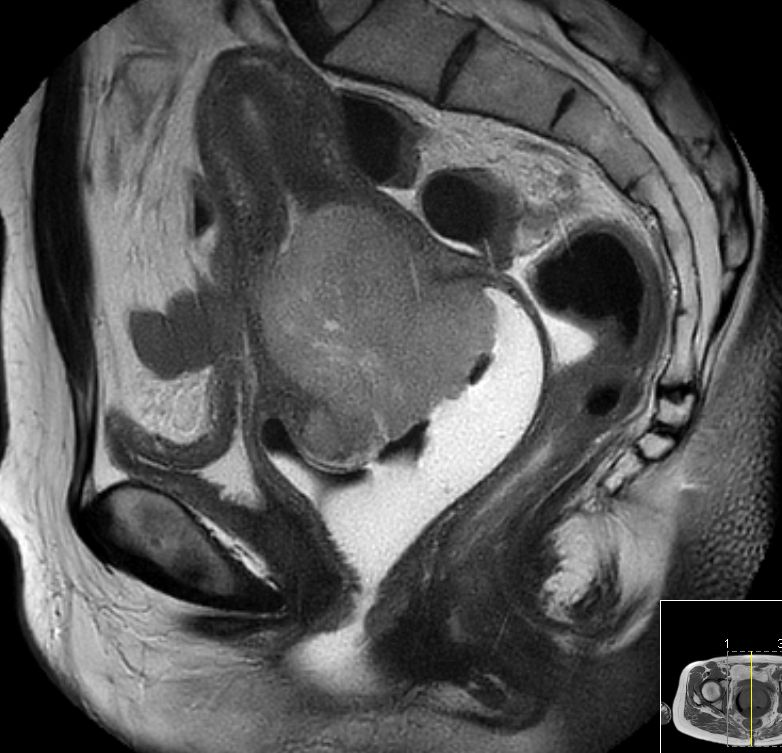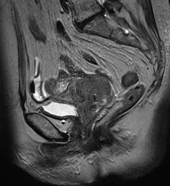 | MRT | 71jährige Frau, die wegen Uterus-Totalprolaps eingeliefert wurde. Der Uterus wurde reponiert und zeigte einen 5cm großen Zervixtumor. | |||