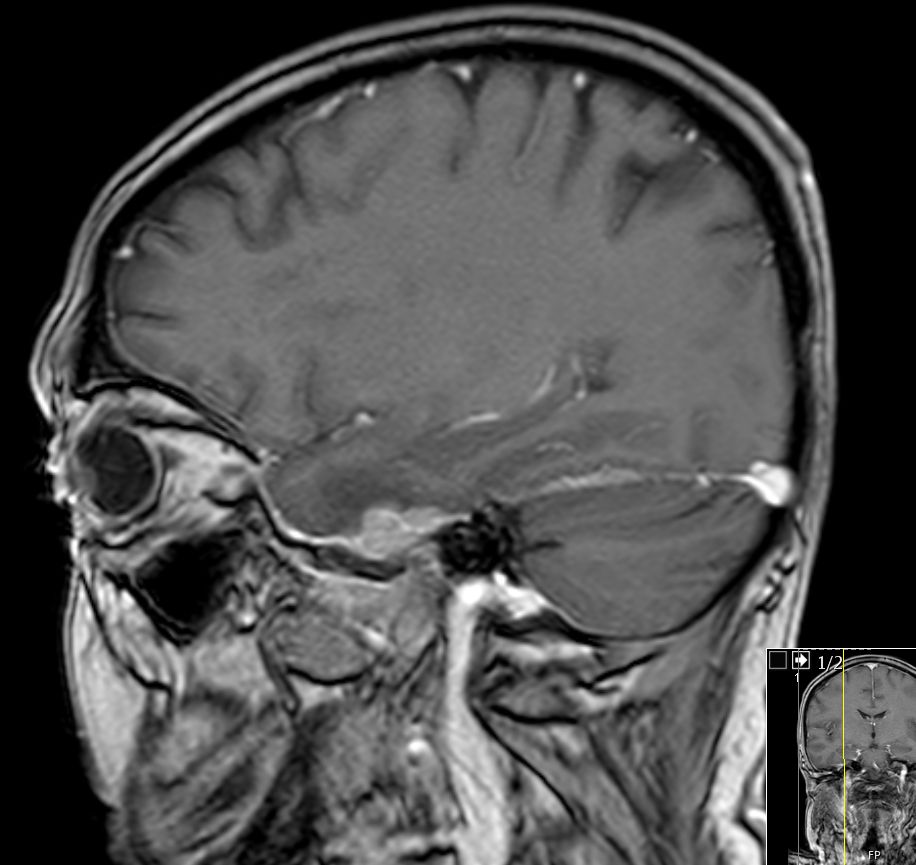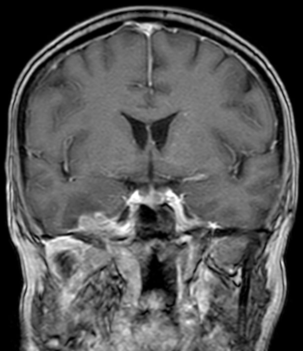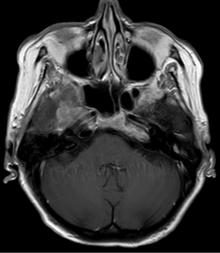 | Schädelbasis | 62-jährige Frau, bei der vor 2 Monaten ein Plattenepithelkarzinom der Zervix FIGO IIIB mit Radiochemotherapie behandelt wurde. Die Uterusgröße hatte von 13 auf 6 cm abgenommen. Jetzt Aufnahme mit der Diagnose Apoplex. | |||