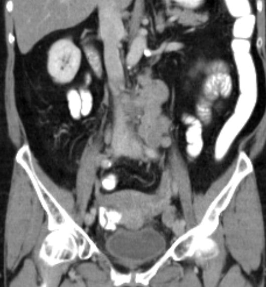 ![]() Großes Lymphknotenkonglomerat links paraaortal. Vergrößerte Lymphknoten an der linken Beckenwand. |