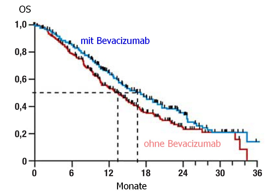 | Antwort 1 | Bevacizumab verlängert das Überleben rezidivierender, persistierender oder metastasierter Zervixkarzinome mit Cisplatin-Paclitaxel oder Topotecan - Paclitaxel von 13,3 auf 17 Monate! | |||||||||||||||||||||||||||||||||