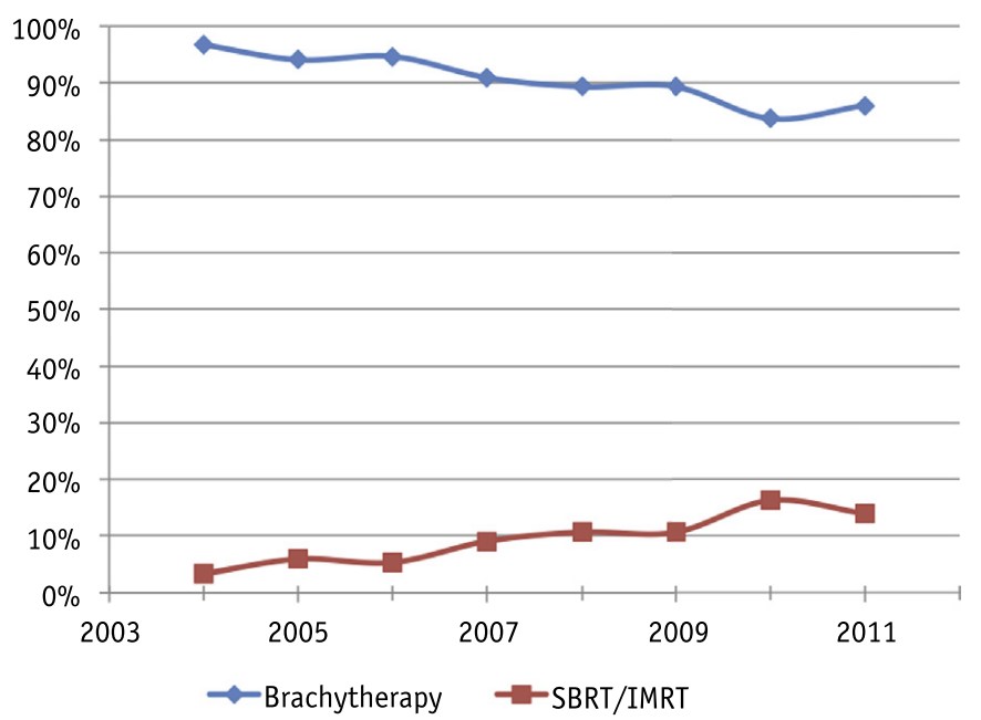 Von 2004 bis 2011 wurde die Brachtherapie zunehmend durch IMRT und SBRT ersetzt ((1).![]() Die Brachytherapie- Anwendung sank von 96.7% auf 86.1%, IMRT+ SBRT stieg von 3.3% auf 13.9% (1). |