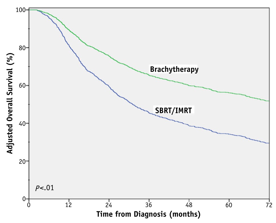 Korrigierte Überlebensrate: Brachytherapie signifikant besser als IMRT und SBRT.![]() Angleichung von Alter, Charlson/Deyo - Score, Stadium, Chemotherapie |
