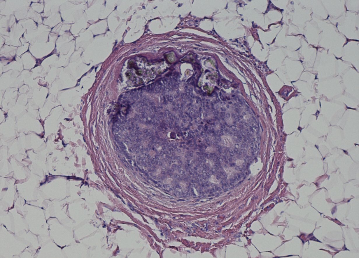 Mikroskopisches Bild eines Milchgangs, der komplett mit atypischen Epithelzellen ausgefüllt ist.