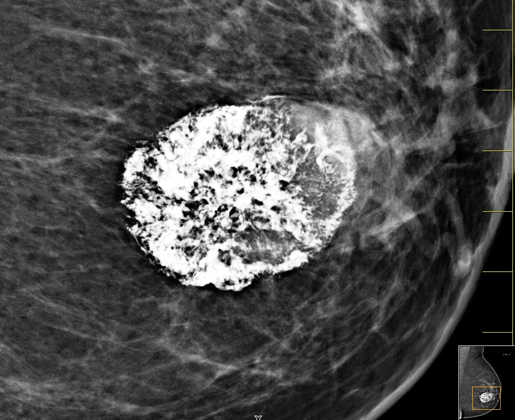 | Fall | 72-jährige Frau, bei der vor 5 Jahren ein gutartiger Tumor diagnostiziert wurde. Vor 8 Monaten war der Tumor auf 4cm angewachsen. Die Exzision wurde empfohlen. Jetzt war der Tumor 66 mm groß, sehr hart und teilweise verkalkt. | |||