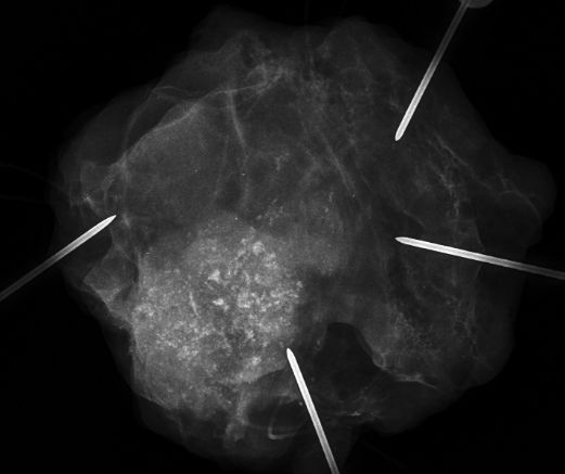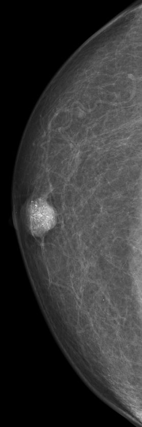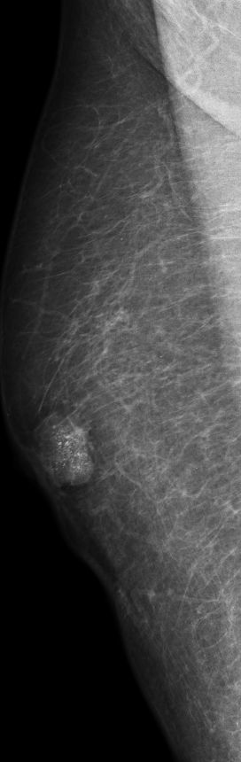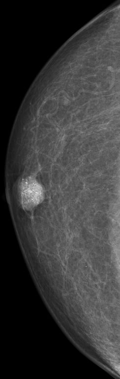 | DCIS | 80-jähriger Mann mit einem Knoten rechts retromamillär. Mammographie: Dichter Knoten mit multiplen Mikroverkalkungen unmittelbar periareolär. Histologie: papilläres DCIS, G2, 19 mm, ER: 12/12, PR: 6/12, Ki-67: 20%. Th.: Exzision, Radiatio der Mamma, TAM über 5 Jahre | ||||