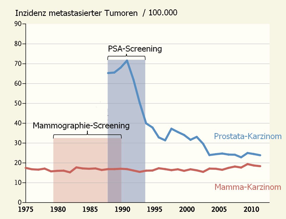 Die verbreitete Einführung des Mammographie-Screenings führte in den USA nicht zu einem Rückgang primär metastasierter Karzinome.![]() Nach Daten von SEER 1975-2012(5) | ||