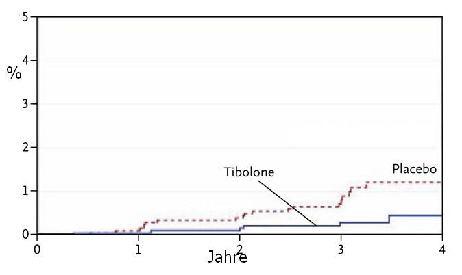 Das Schlagabfallrisiko betrug 219% mit Tibolon (100% ohne Tibolon) |