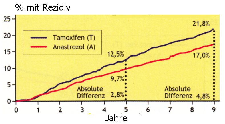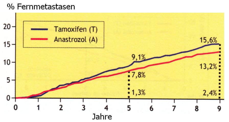 Mit anastrozol signifikant weniger Fernmetastasen als mit Tamoxifen.![]() | ||