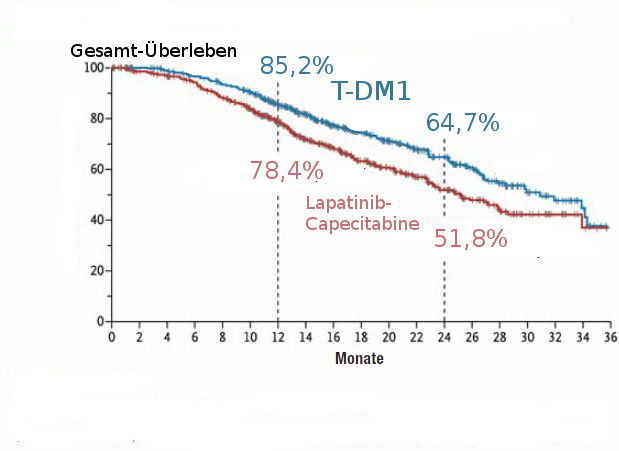 Das Gesamtüberleben war 12 und 25 Monate nach T-DM1 signifikant höher als nach Lapatinib - Capecitamin. | |||||||||||||||||||||||||