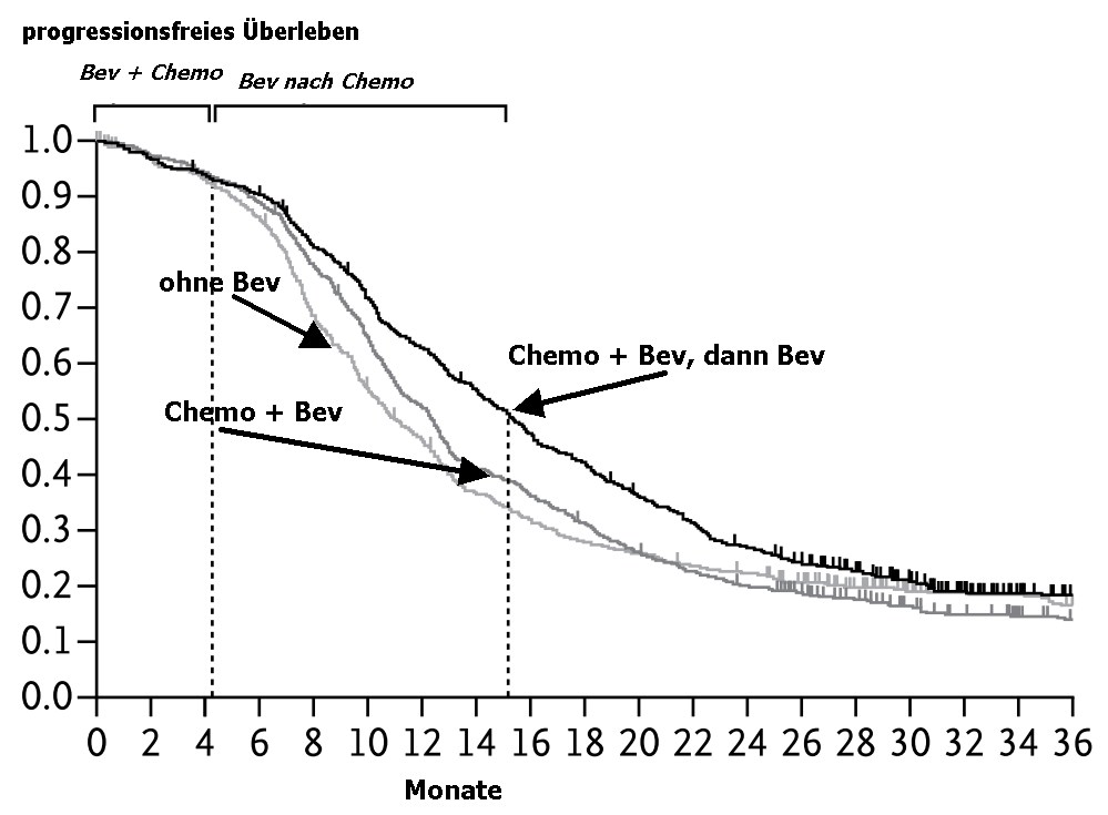 | Fragestellung | Verbessert Bevacizumab (Avastin) das Behandlungsergebnis einer postoperativen CP-Chemotherapie fortgeschrittener Ovarialkarzinome? | ||||||||||||||