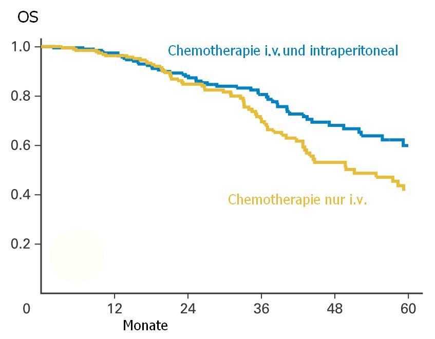 Nach radikaler Operation im Stadium III kann eine intraperitoneale Chemotherapie bessere Ergebnisse erzielen als eine i.v.-Chemotherapie(6,7,8). |