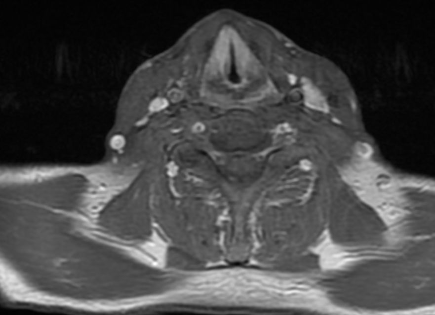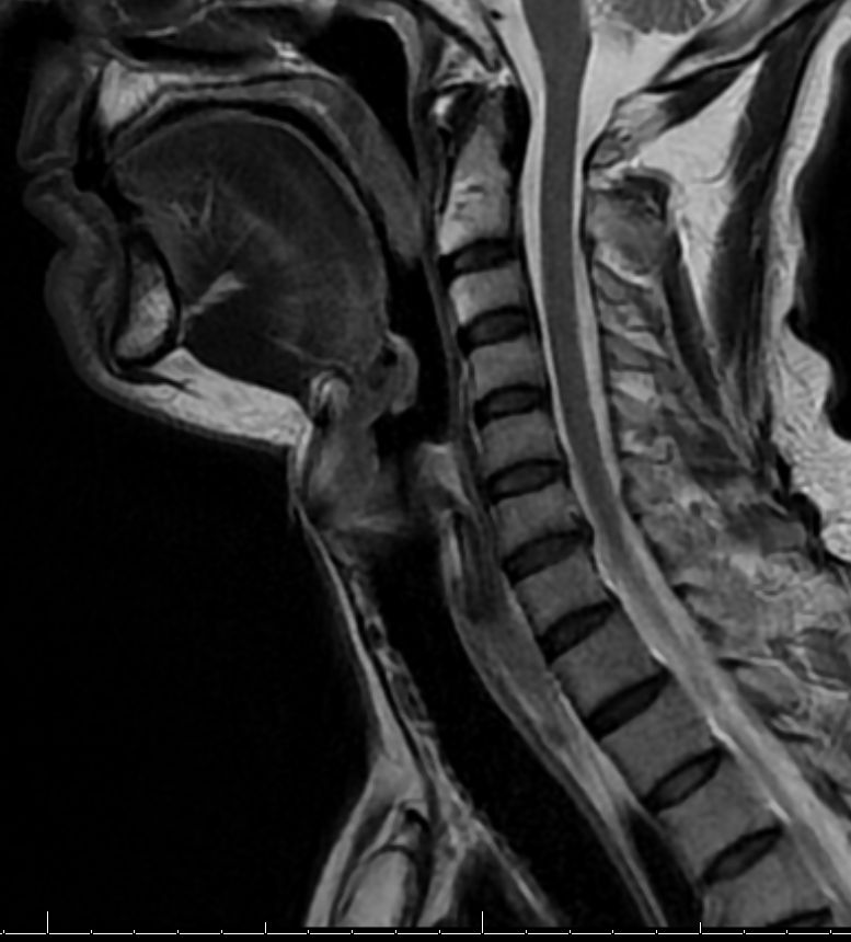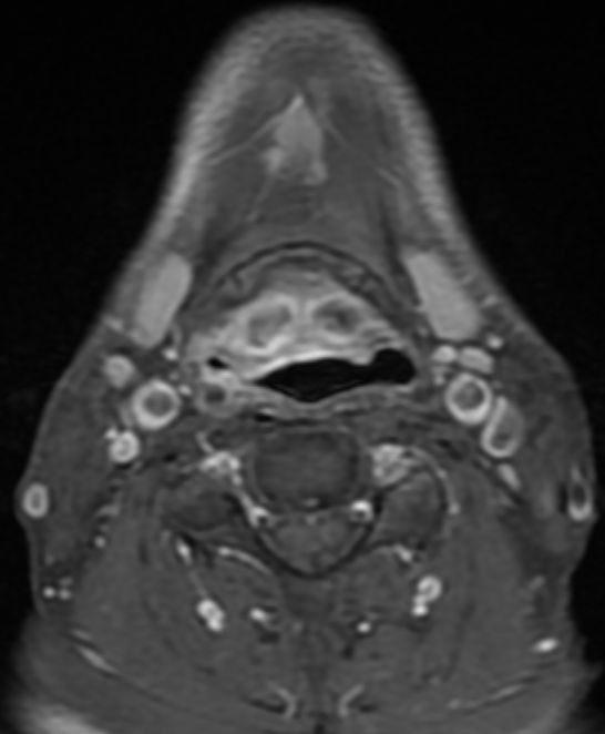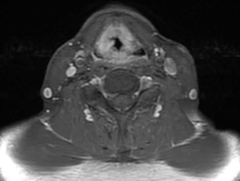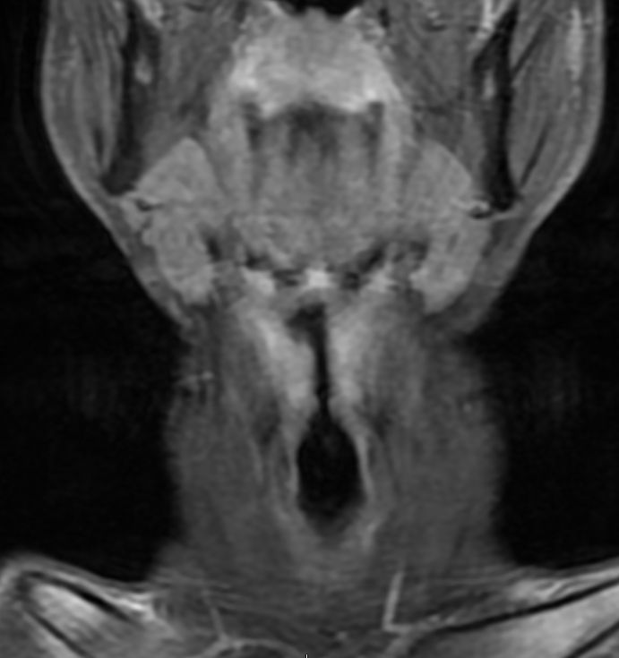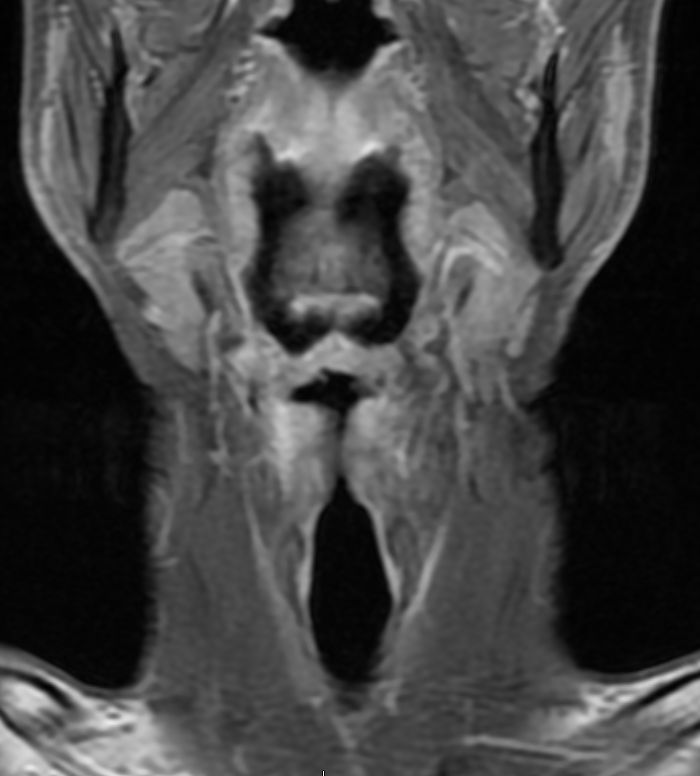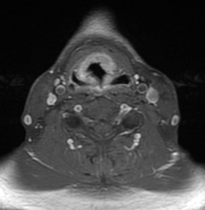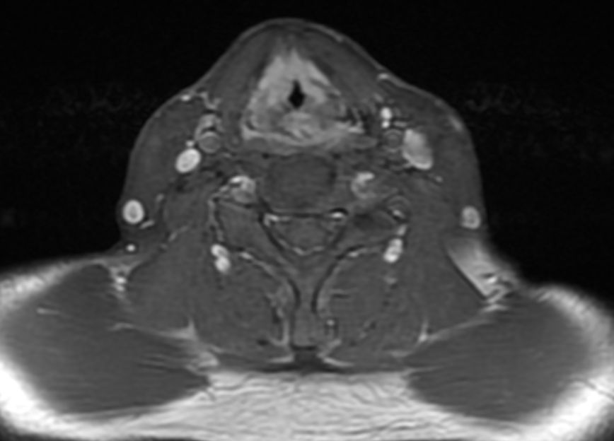 57-jähriger Mann mit langjährigem Alkohol- und Nikotinabusus. Seit 6 Monaten Schluckbeschwerden. Jetzt zunehmende Kachexie. MRT: Ausgedehntes supraglottisches Larynxkarzinom mit Schildkrorpel-Infiltration. Kehlkopfteilresektion mit ND. Histologie: unverhornendes Plattenepithelkarzinom, V0 R1 G1 - 2 Stadium post OP: pT3 pN0 (0/7) M0 | ||