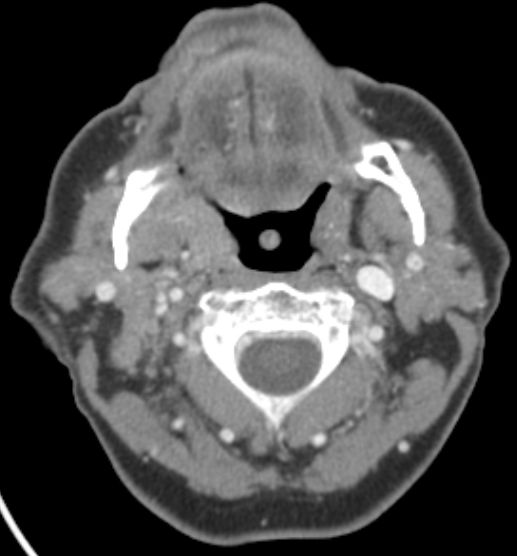 | CT | Alveolarkamm - Karzinom des linken Unterkiefers mit großem Lymphknotenkonglomerat unter dem Musculus sternocleidomastoideus