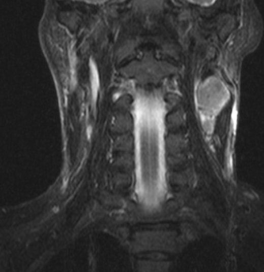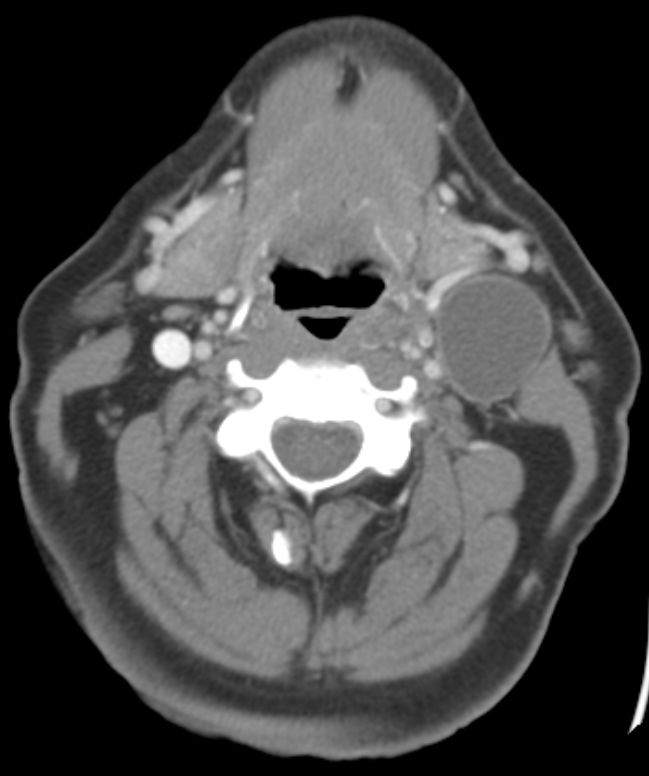 66-jähriger Mann mit einem zystischen 34mm großen Knoten links am Hals.