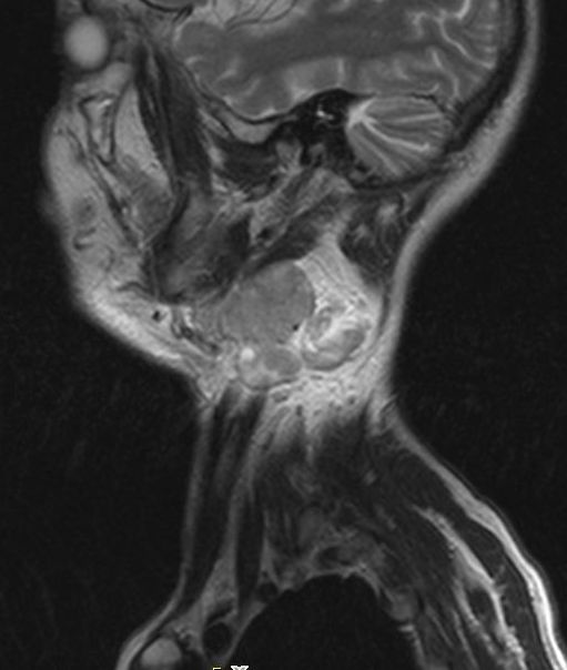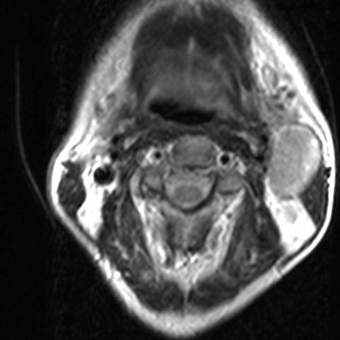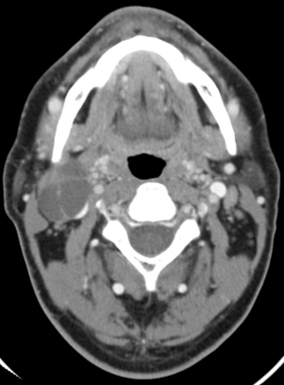 Tonsillentumor asymptomatisch. Das große Lymphknotenpaket am Unterkieferwinkel war aufgefallen. | ||||