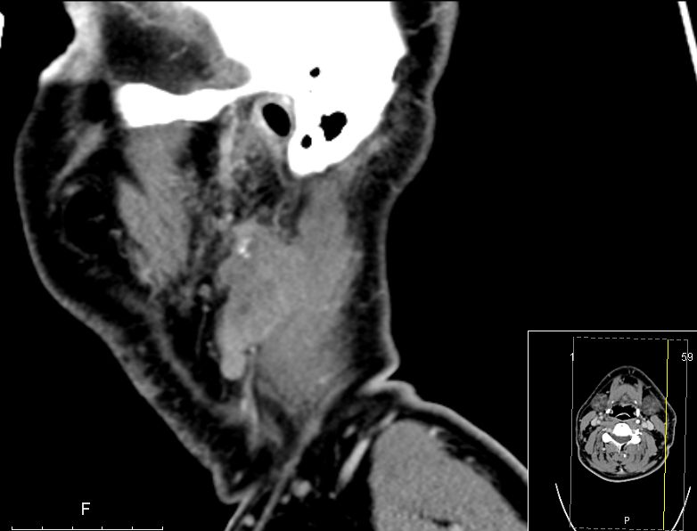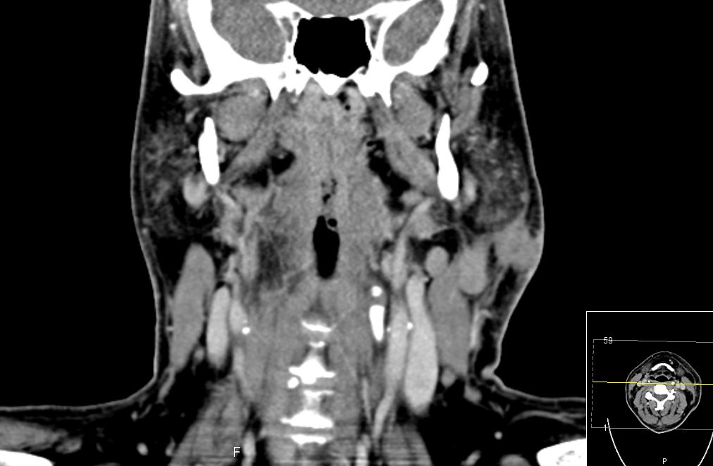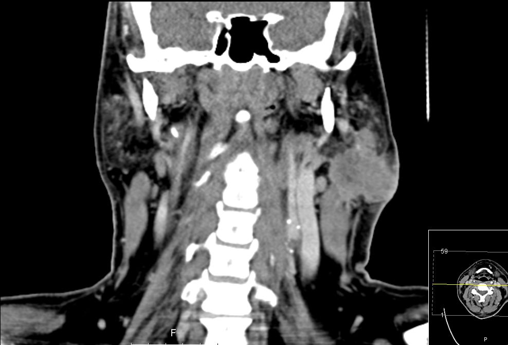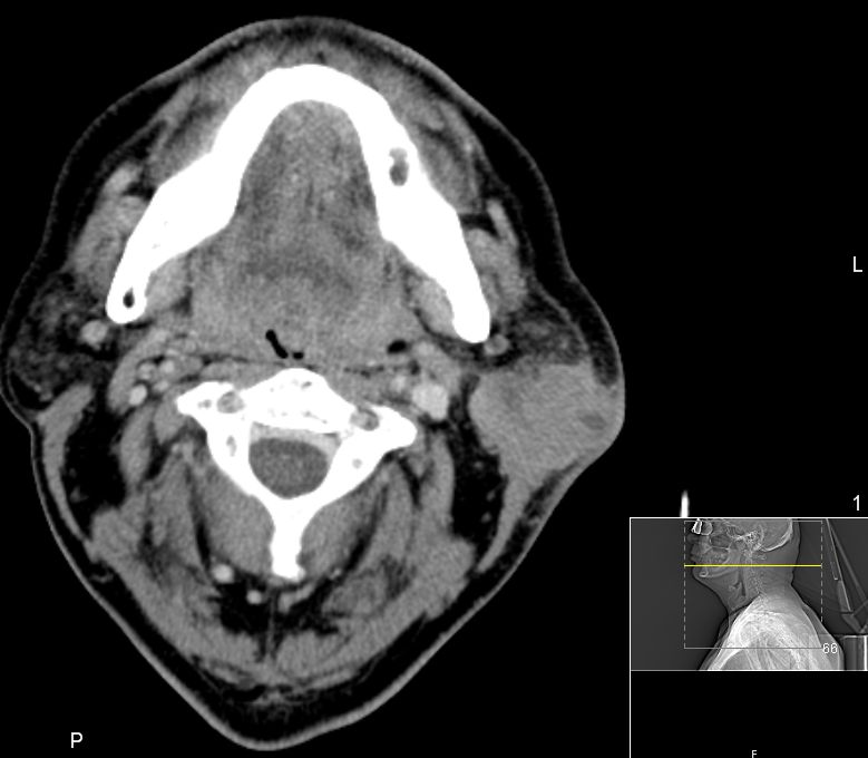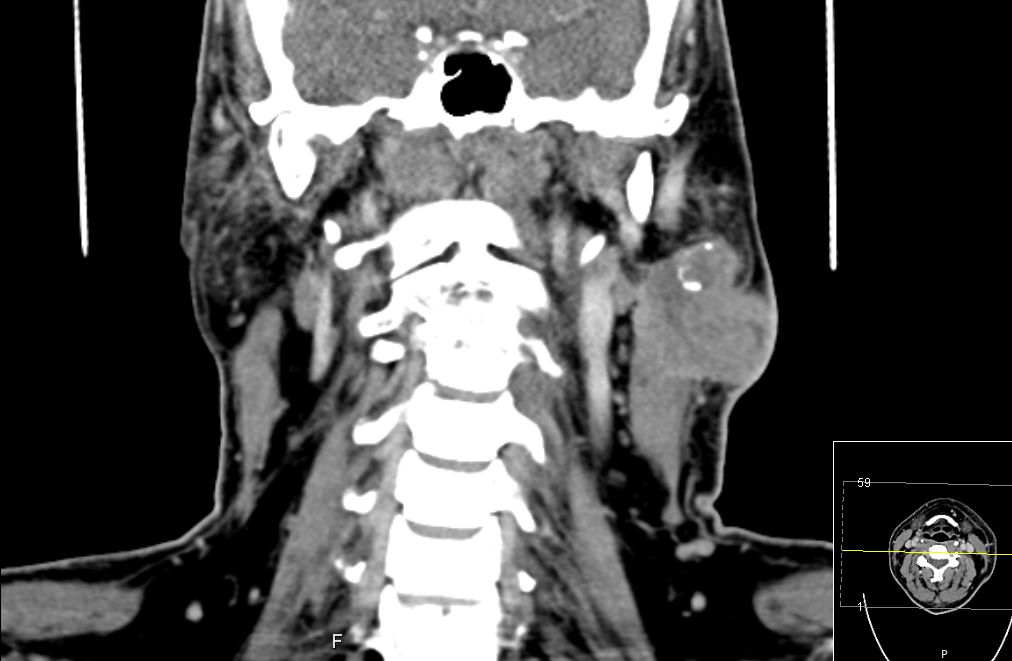 | CT | 51-jähriger Mann, der eine Gesichtsschwellung bemerkte. Adenokarzinom pT3 pN1 Mo L1 G3. Subtotale Protidektomie unter Neuromonitoring, ND LI und II links, Adjuvante RT. ![]() |