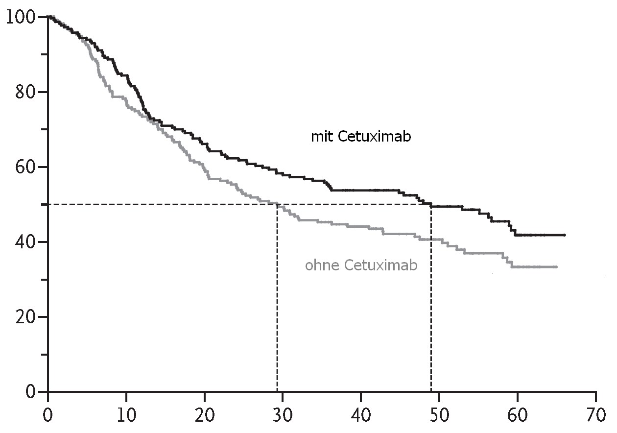 Cetuximab erhöht das Gesammtüberleben und die lokoregionäre Kontrolle einer Bestrahlung lokal fortgeschrittener HNO-Tumore signifikant. | |||||||||||||||||||||||