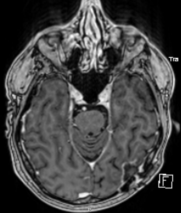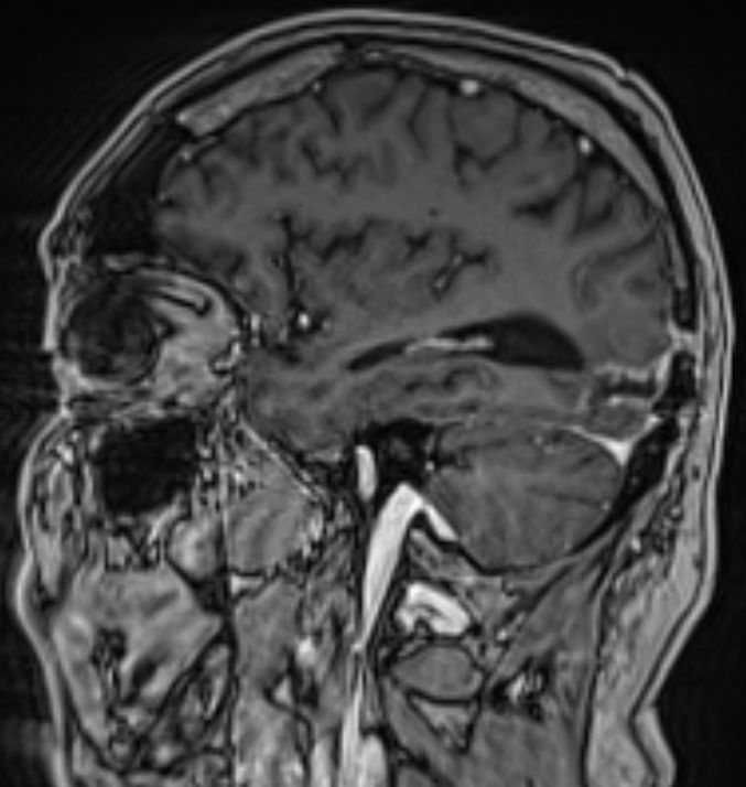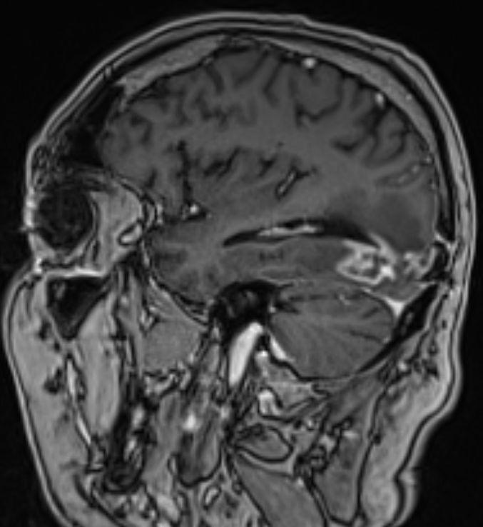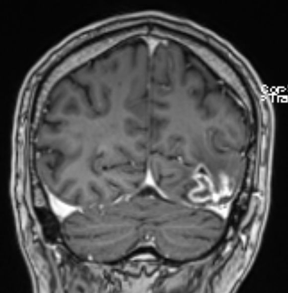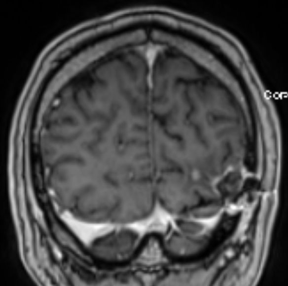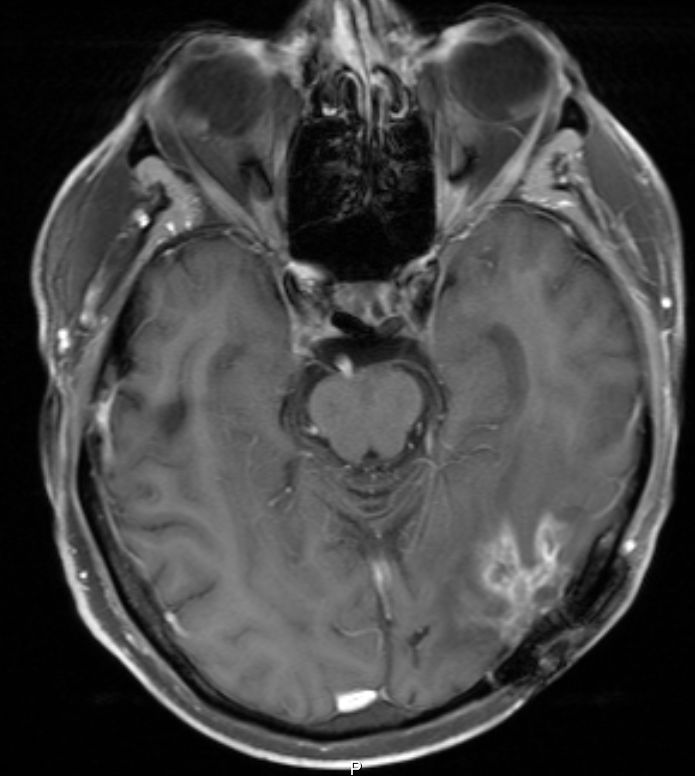 | Die MRTs zeigen eine Zunahme der Gadolinium-anreichernden Bezirke. Die Exzision erbrachte Großhirngewebe mit Anteilen einer Nekrose. Kein Tumorgewebe. | |||||||||||||||||||||||||||||||||||||||||||