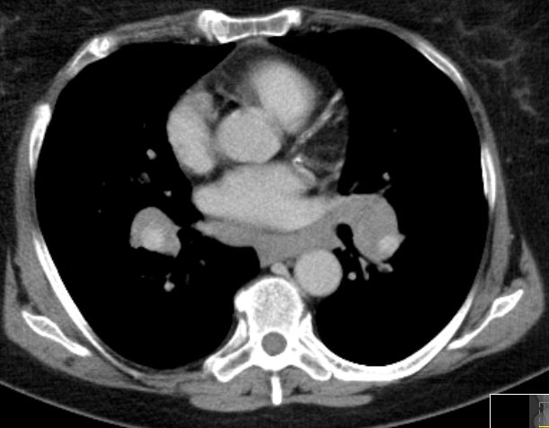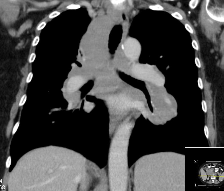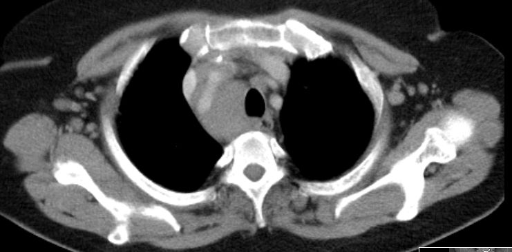 Raumforderung im Mediastinum mit Ummauerung der Trachea, der Vena cava superior.