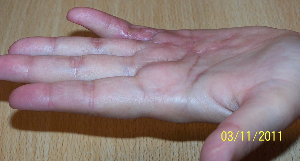 | 78-jähriger Mann mit einem verhärteten, längs verlaufenden Strang im 3. Strahl der Handfläche.