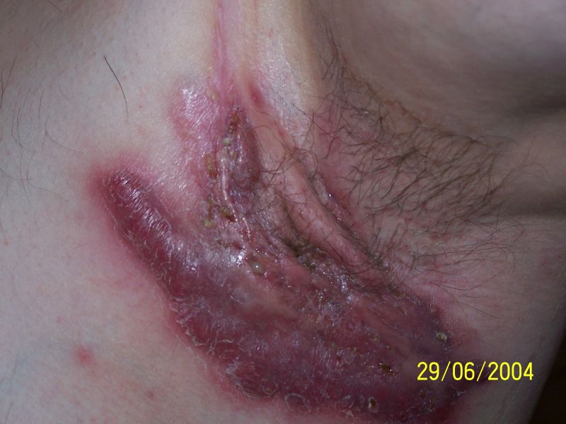 | Symptome | Schmerzhafte, tief sitzende Entzündung in den apokrinen Drüsen der Achsel, der Leisten und der anogenital Region. Manifestation meistens Frühjahr bis Herbst. Symptomarme Zeit im Winter. Maurer häufig befallen. | ||||||||