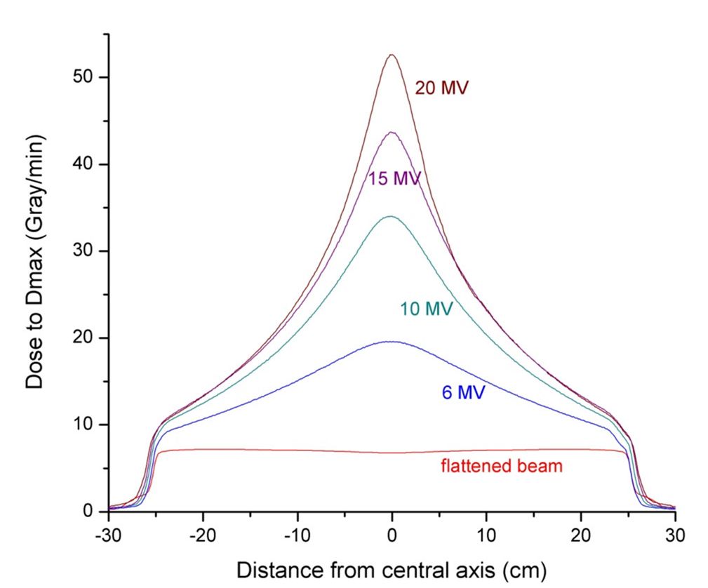 Mit neuen Planungssystemen sind auch Beschleuniger ohne Ausgleichsfilter verwendbar. Vorteile sind die höhere Dosisleistung, verringerte Streustrahlung und geringere Strahlerkopf-Leakage. | ||||||||||||||||||||||||||||||||