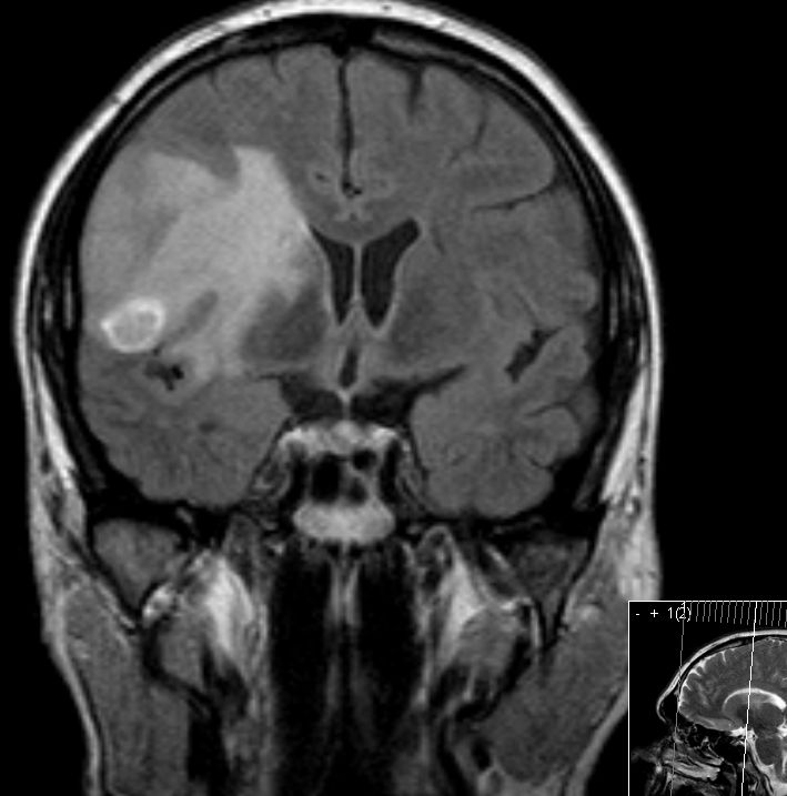 metastasiertem Nierenzellkarzinom. Jetzt Metastase rechts temporal mit