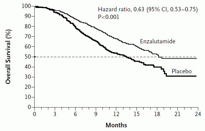 | Studie | Phase III, doppelt blind, Placebo - kontrolliert. Randomisiert 2: 1 Enzalutamid - Placebo. Stratifizierung nach Performancestatus und Schmerzintensität. Abbruch nach Interimaanalyse von 520 Sterbefällen. | ||||||||||||||||||||||||||||||||