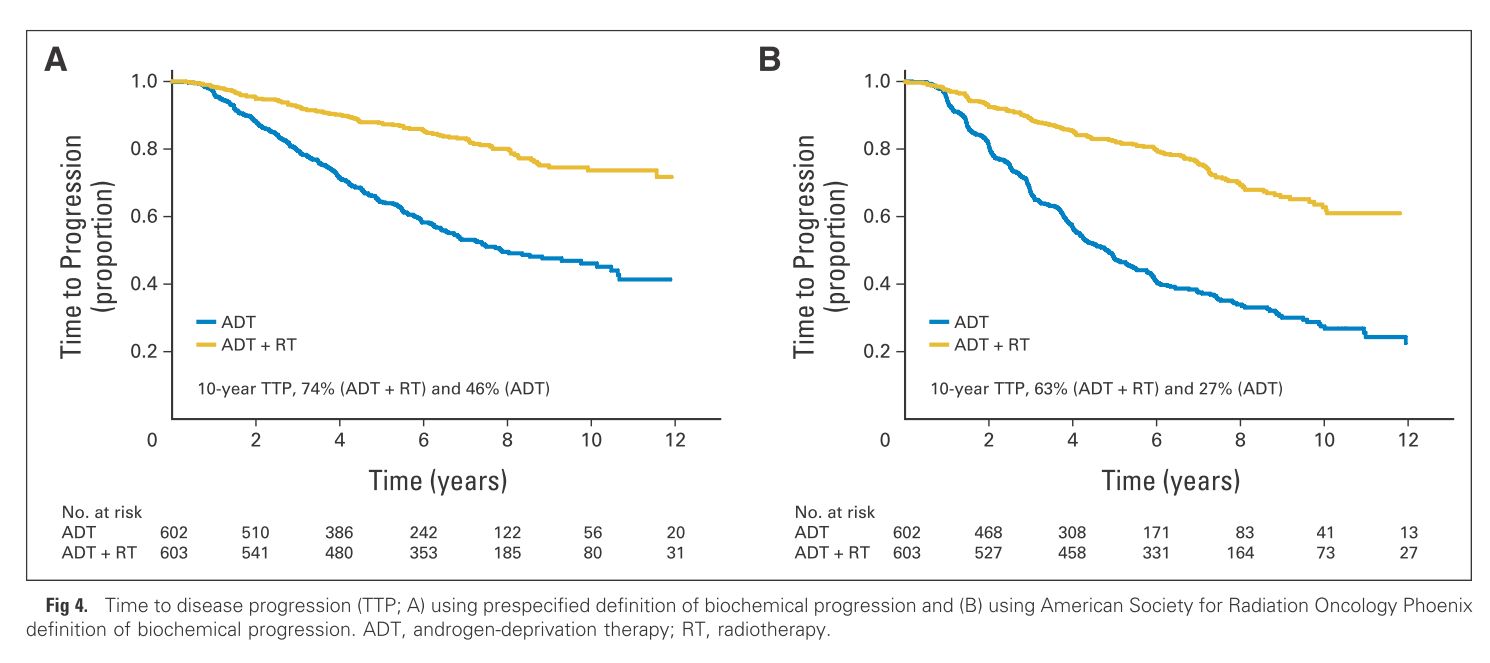 602 to ADT alone and 603 to ADT RT. At a median follow-up time of 8 years, 465 patients had