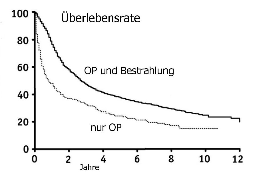 | Bestrahlung | Eine postoperative Bestrahlung verbessert signifikant das Überleben anaplastischer Astrozytome.![]() Modifiziert nach (3). SEER-Analyse. | ||