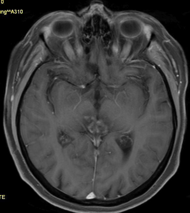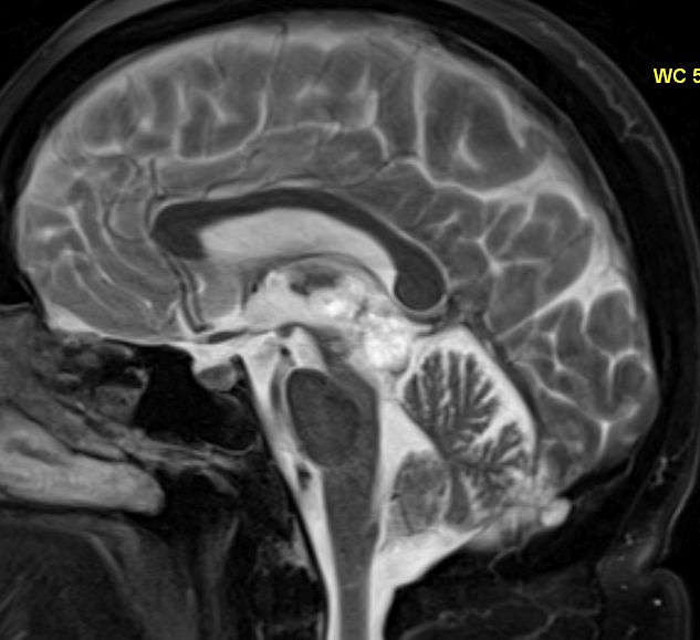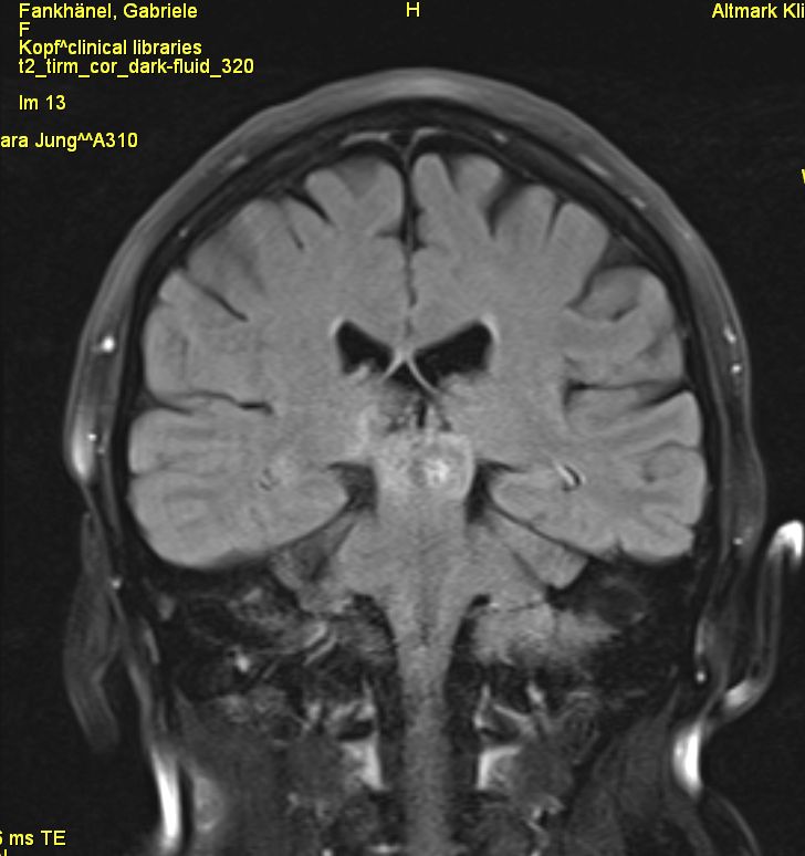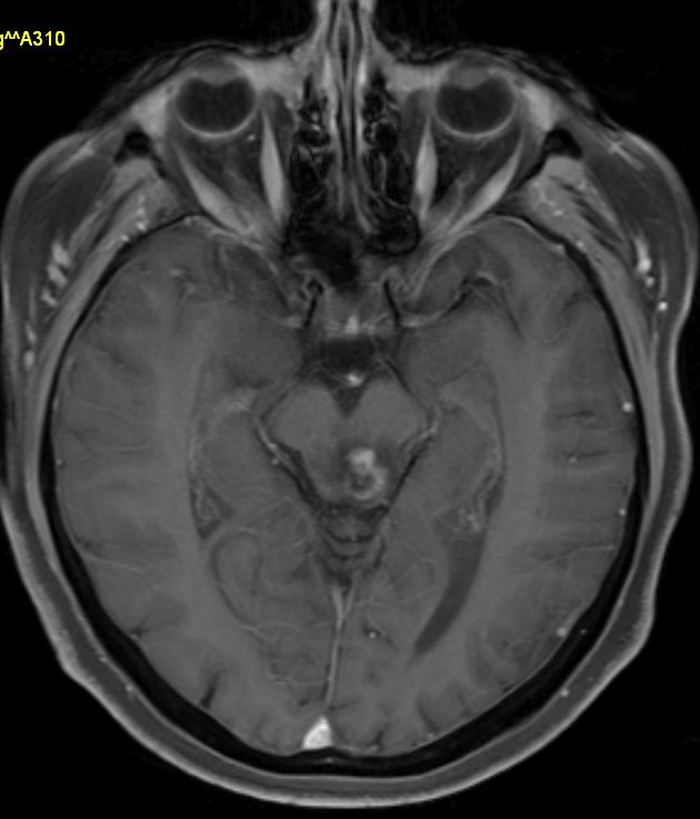 | Vierhügelplatte | 66-jährige Frau mit Sehstörungen, Ptose rechts mehr als links, Gehörverschlechterung und Gleichgewichtsstörungen. Stereotaktische Biopsie: Astrozytom Grad 3 (Grad unsicher).![]() |