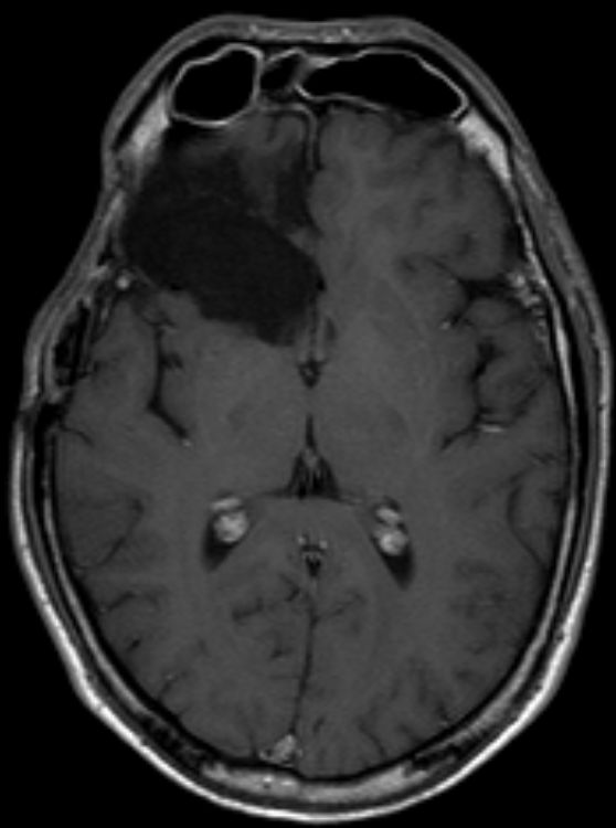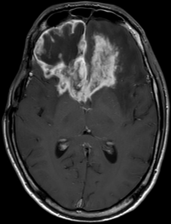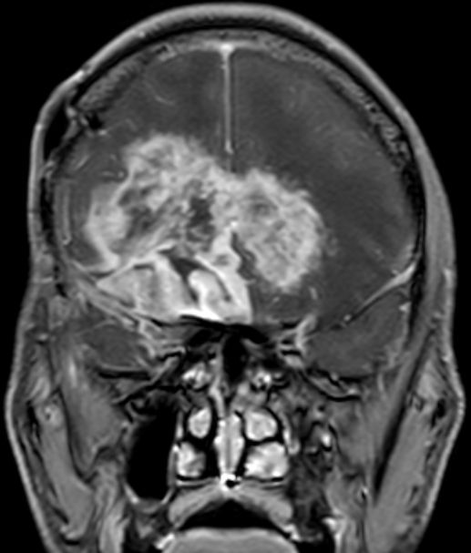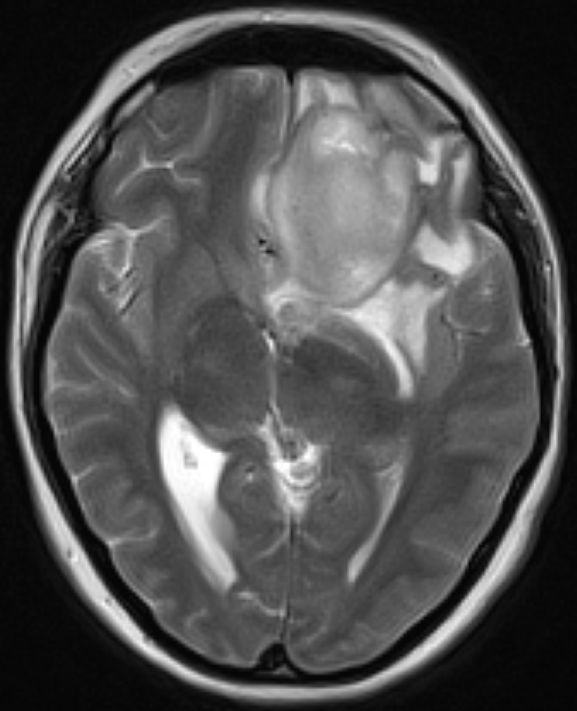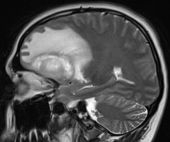 Jetzt Krampfanfall. Das MRT zeigt ein großes frontales Schmetterlingsgliom.![]() | |||